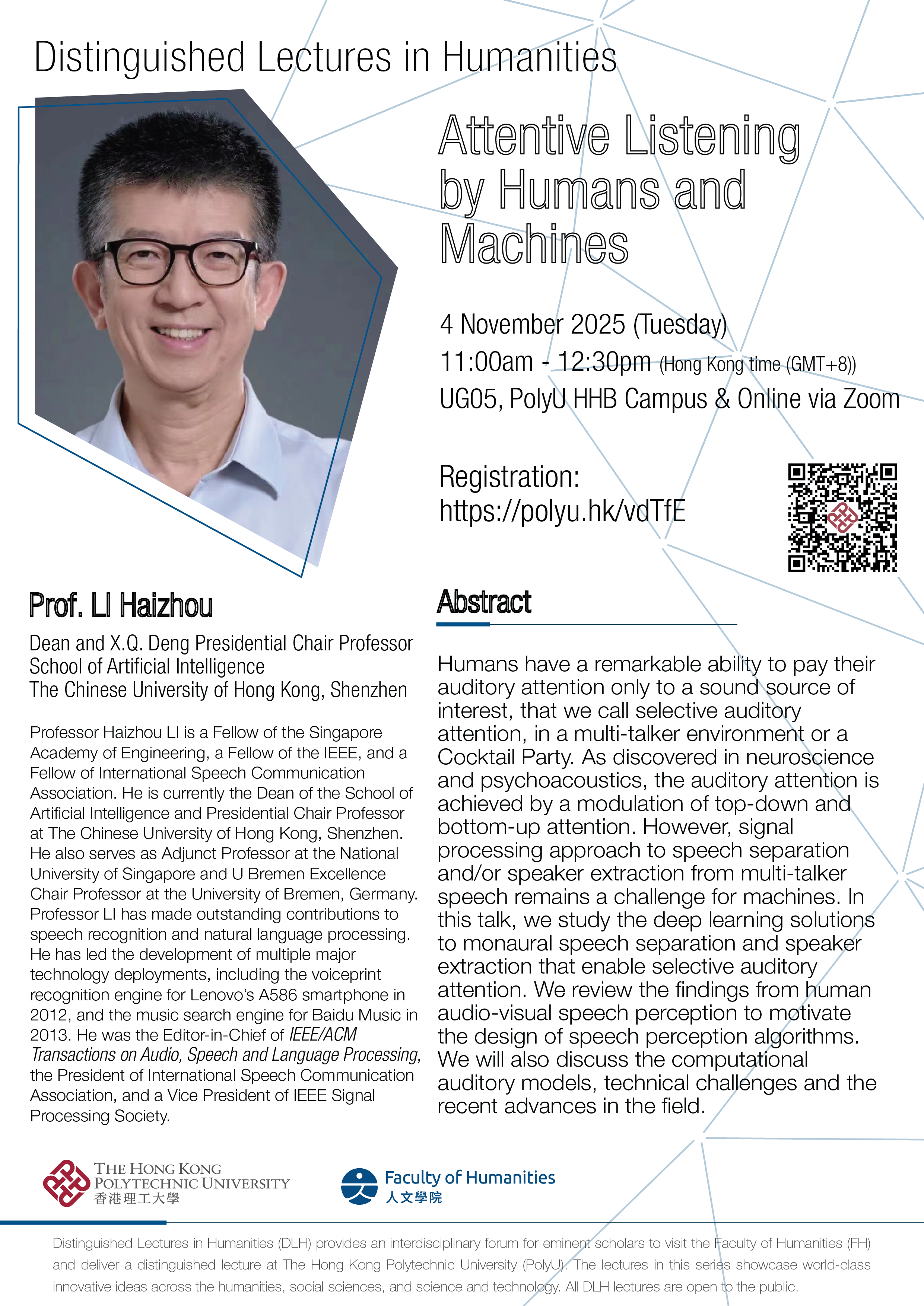 Professor Haizhou LI is a Fellow of the Singapore Academy of Engineering, a Fellow of the IEEE, and a Fellow of International Speech Communication Association. He is currently the Dean of the School of Artificial Intelligence and Presidential Chair Professor at The Chinese University of Hong Kong, Shenzhen. He also serves as Adjunct Professor at the National University of Singapore and U Bremen Excellence Chair Professor at the University of Bremen, Germany.