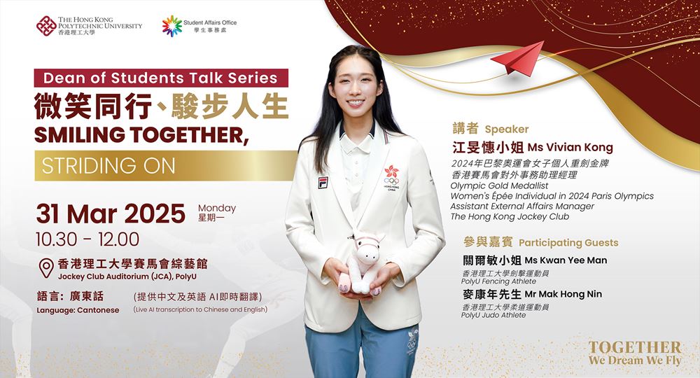 Themed “Together We Dream, We Fly (追夢人生)”, the Dean of Students Talk Series encourages and inspires students to pursue their dreams, achieve their aspirations, and develop their full potential in all aspects of their lives by featuring the stories and the personal journeys of renowned leaders with remarkable accomplishments, including entrepreneurs, industrialists, academic experts, etc., who are invited to pass their nuggets of wisdom on to PolyU students, staff, alumni and friends.