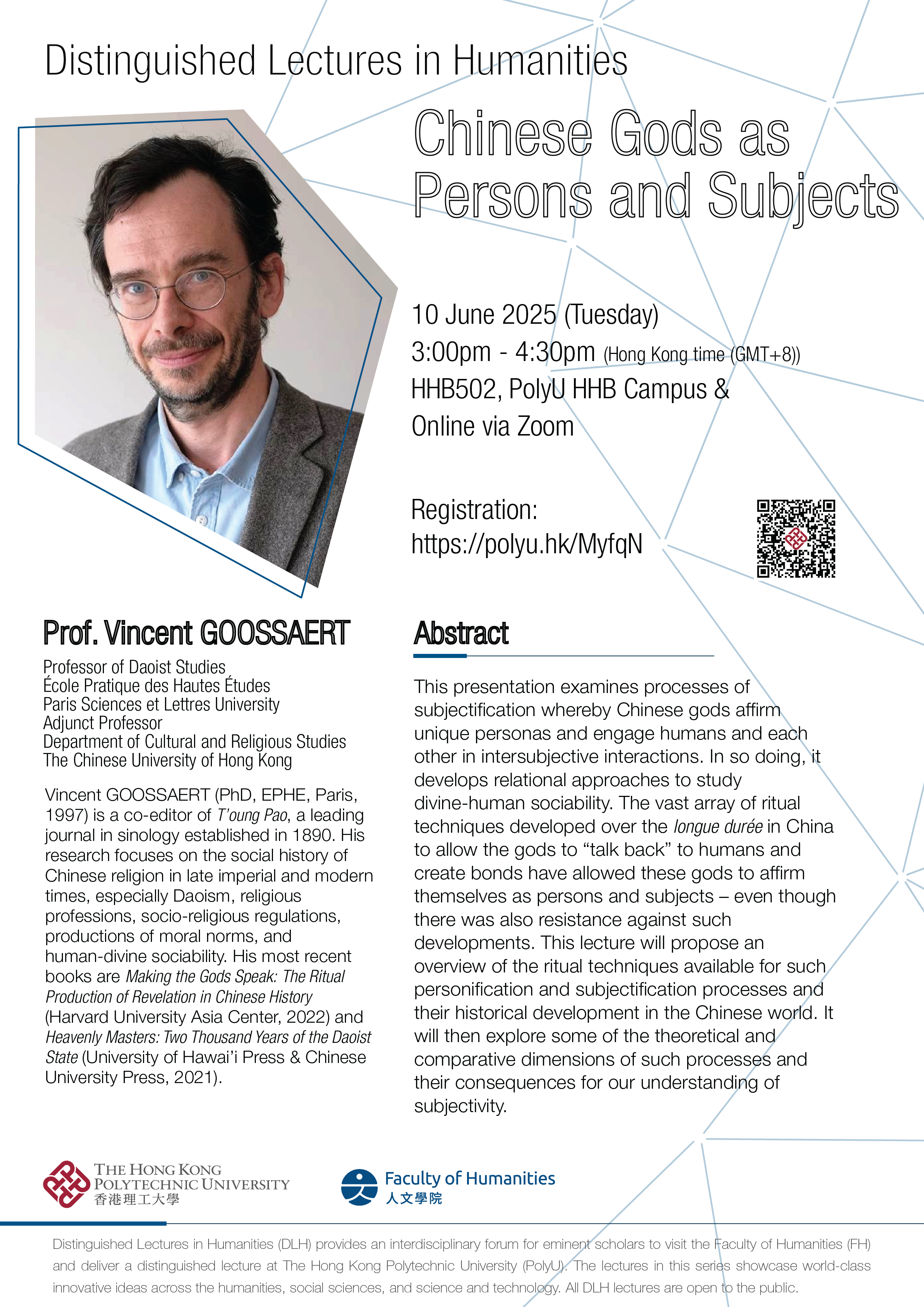 This presentation examines processes of subjectification whereby Chinese gods affirm unique personas and engage humans and each other in intersubjective interactions. In so doing, it develops relational approaches to study divine-human sociability. The vast array of ritual techniques developed over the longue durée in China to allow the gods to “talk back” to humans and create bonds have allowed these gods to affirm themselves as persons and subjects – even though there was also resistance against such developments. This lecture will propose an overview of the ritual techniques available for such personification and subjectification processes and their historical development in the Chinese world. It will then explore some of the theoretical and comparative dimensions of such processes and their consequences for our understanding of subjectivity.