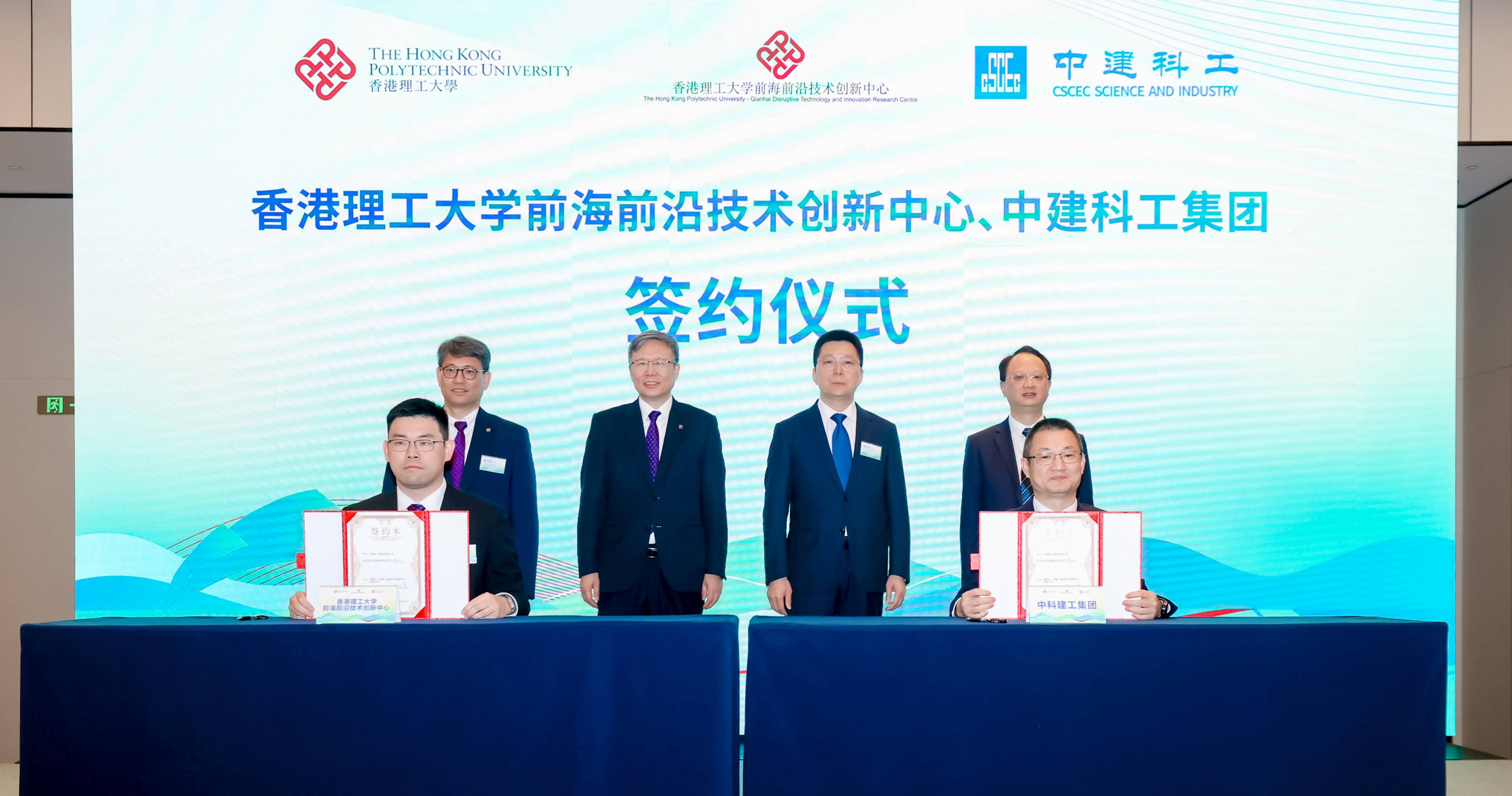 理大前海前沿技術創新中心與中建科工集團簽署合作備忘錄。在滕錦光教授(後排左二)、趙汝恒教授(後排左一)、楊書華先生(後排右二)及中建科工集團副總經理蔣禮先生(後排右一)見證下,由魏敏晨教授(前排左)及中建科工創新研究開發院院長李任戈先生代表簽署(前排右)。 |