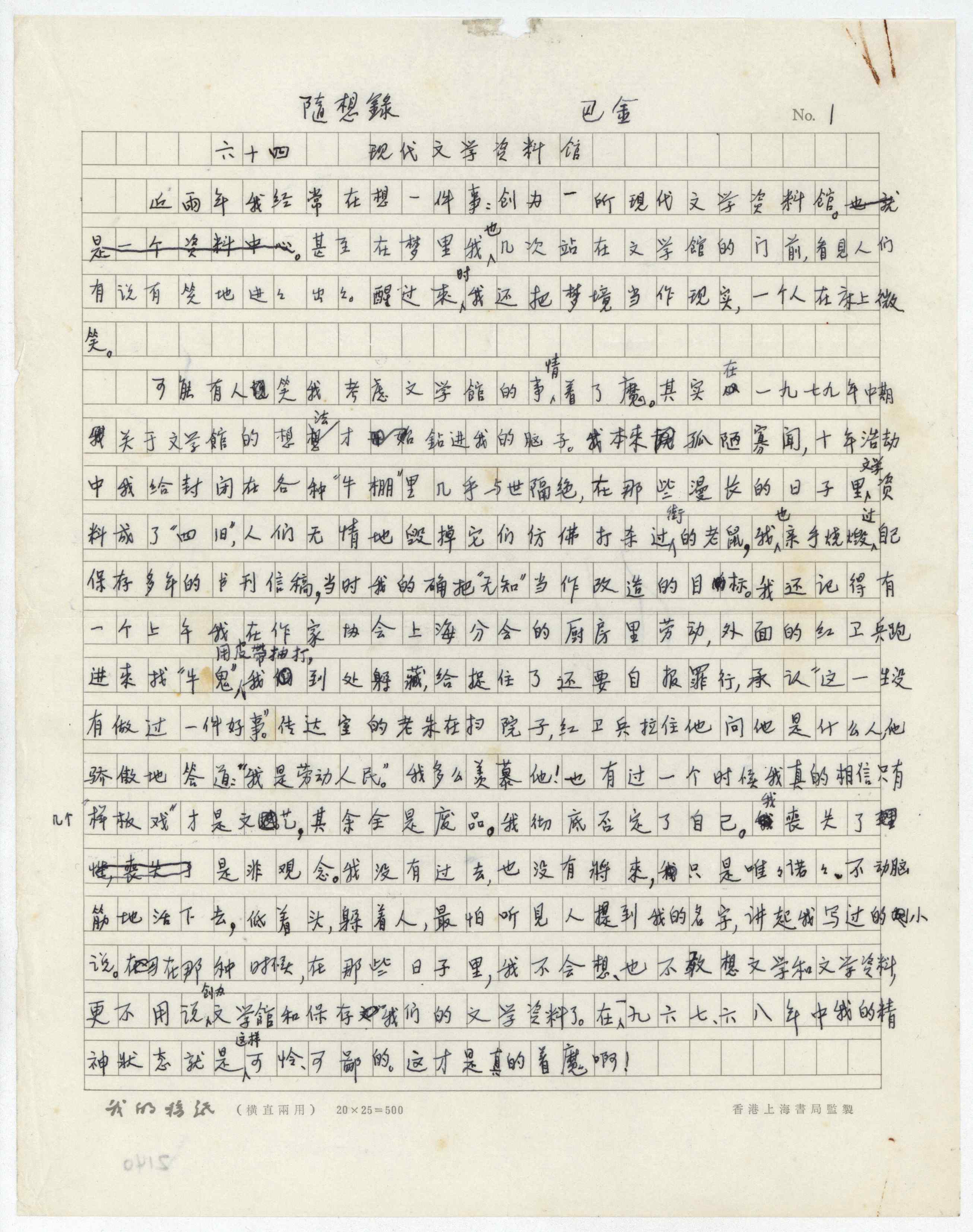 中國現代文學館館藏巴金《隨想錄》珍貴手稿將於理大校園展出。 |