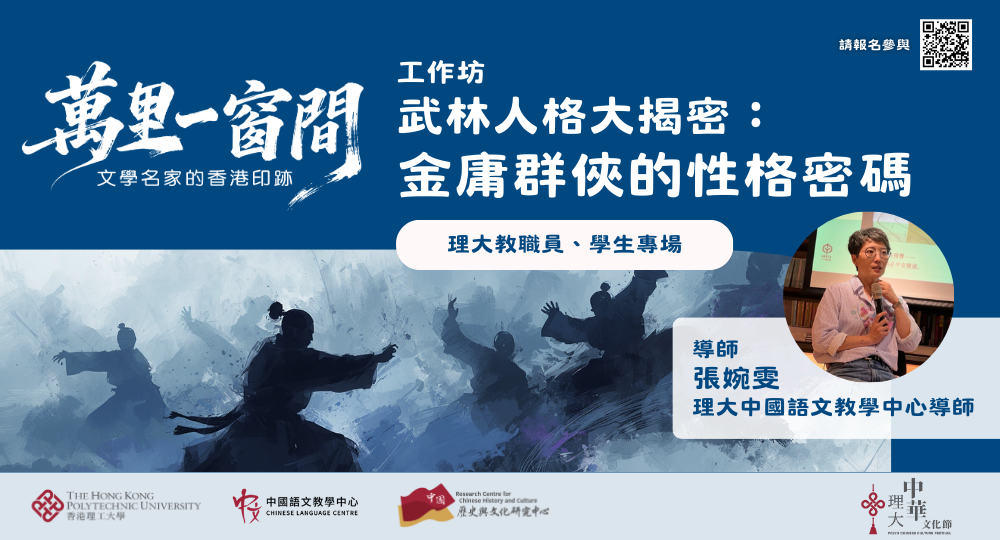 「武林人格大揭密:金庸群俠的性格密碼」工作坊將由理大中國語文教學中心張婉雯導師於3 月 26 日主講。 |