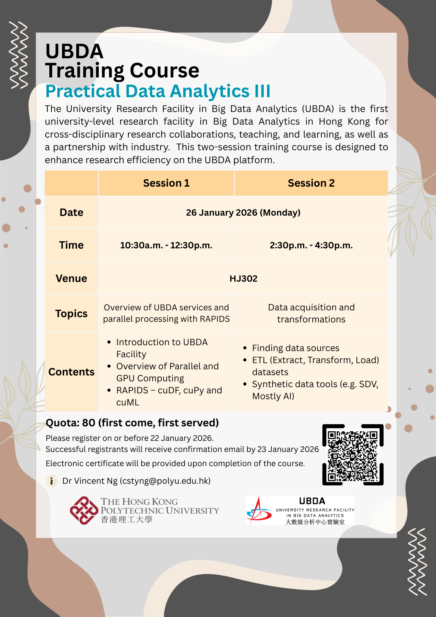 You are cordially invited to attend the University Research Facility in Big Data Analytics (UBDA) training course to be held on 26 January 2026. UBDA is the first university-level research facility in Big Data Analytics in Hong Kong for cross-disciplinary research collaborations, teaching, and learning, as well as a partnership with industry.